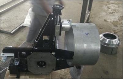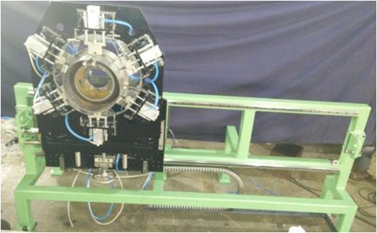 Hydraulic gripper mounted on liner slide with servo rotary axis clamp the band from butt welding moves out and swing to 180º, locate the band in Trimmer housing for flash trimming operation.